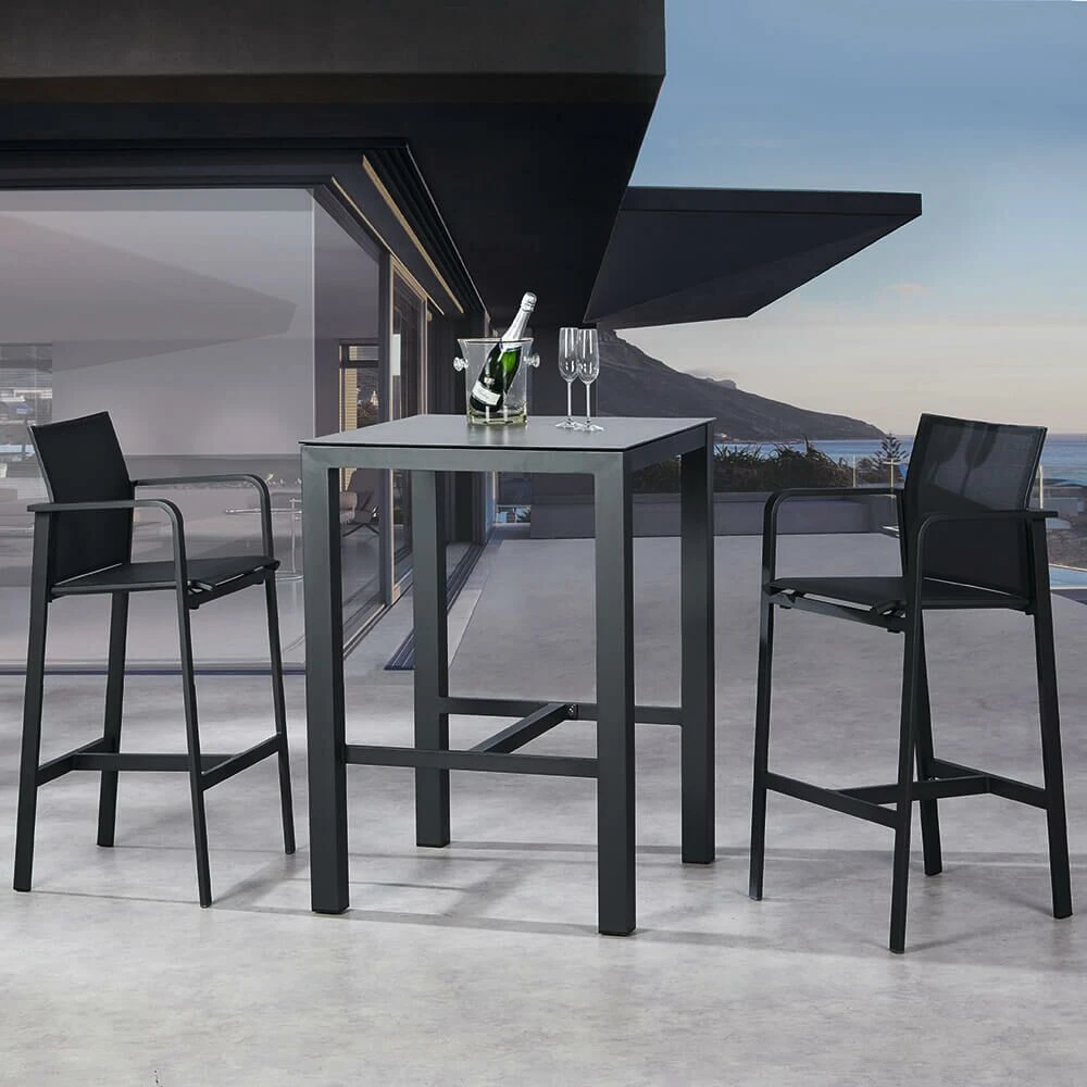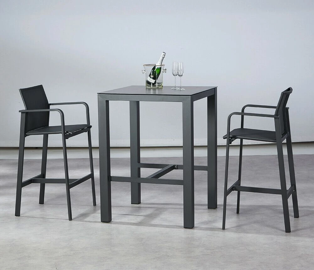 Unsere hochwertigen Gartenmöbel zeichnen sich durch eine hohe Robustheit gegenüber Witterung aus. Egal ob auf dem Balkon, auf der Terrasse oder im Garten platziert, besticht der Stuhl durch ein elegantes Design. Die Sitz- sowie Rückenfläche werden aus luftdurchlässigem Ergotex gefertigt, einem Polyester, welches sich durch eine hohe Komfortabilität, Strapazierfähigkeit, Atmungsaktivität und Wasserresistenz auszeichnet. Das leichte Gestell aus rostfreiem Aluminium sorgt für ein leichtes Handling und wird farblich pulverbeschichtet. Die Tischplatte wird aus einer pflegeleichten, 12mm dicken HPL-Schicht gefertigt. HPL ist ein unter Hochdruck gepresstes Laminat, welches durch die Zugabe von Melaminharz extrem stabil und hitzebeständig bis zu 180°C wird. Die bruchsichere Tischplatte ist robust gegenüber Kratzern sowie Nässe.