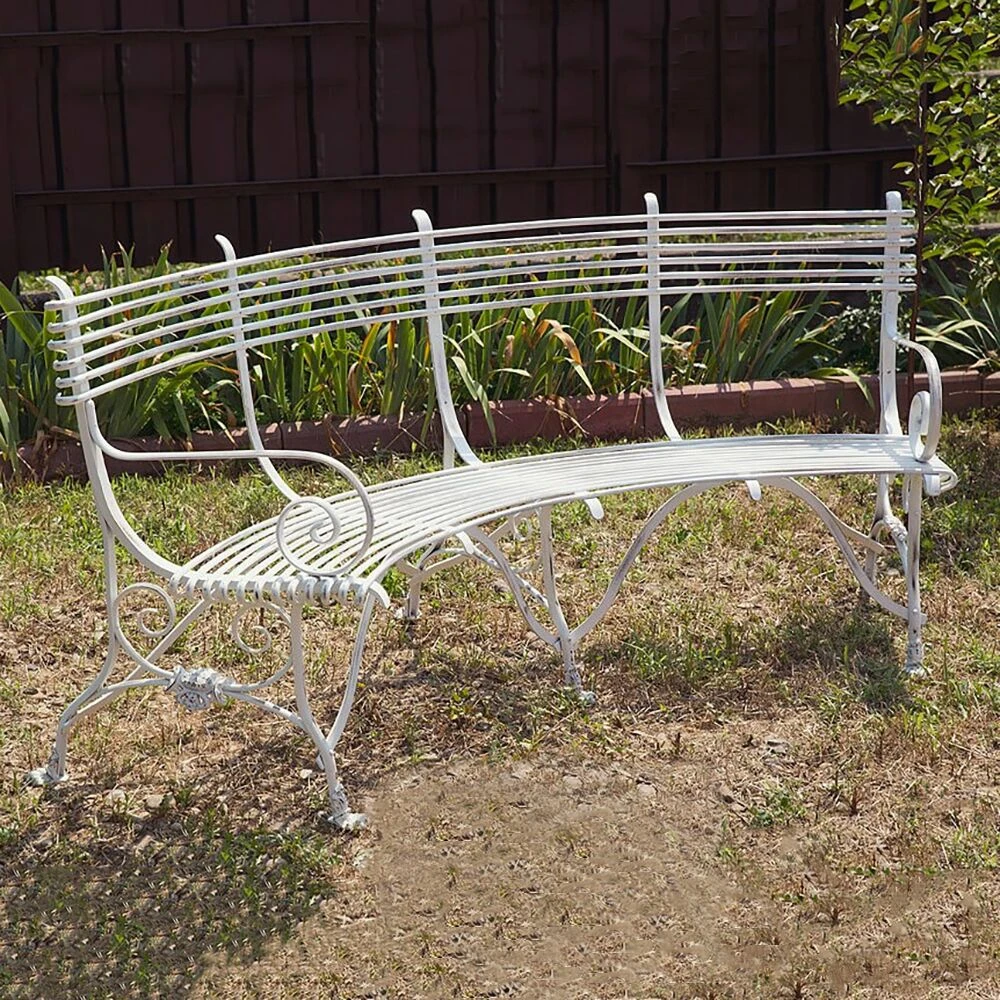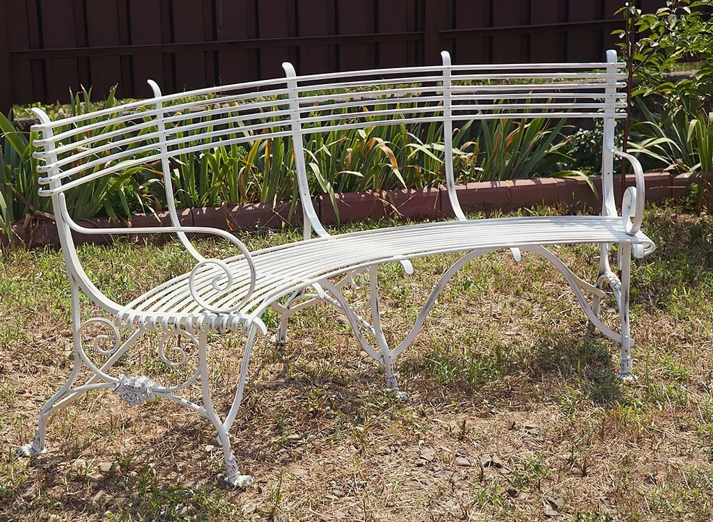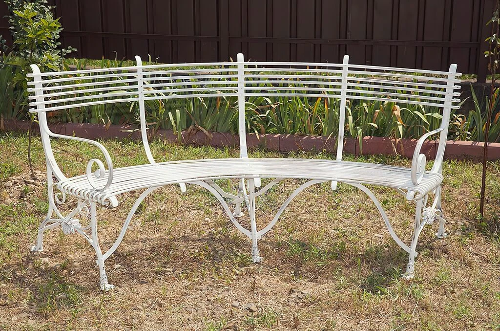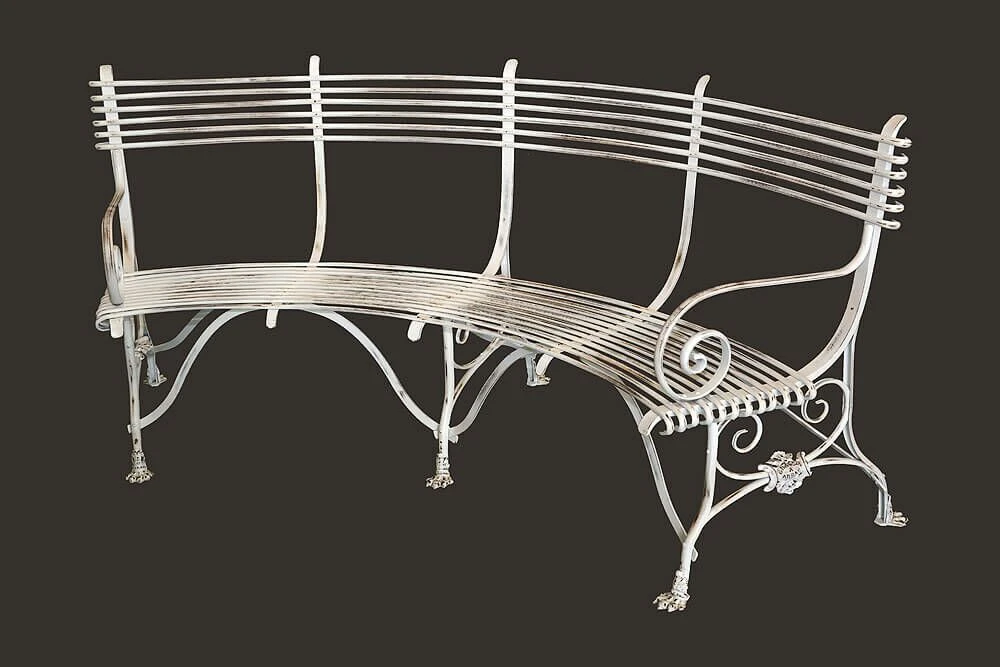 Diese gebogene antike Gartenbank aus Schmiedeeisen wird in einer traditionsreichen Kunstschmiede in Handarbeit gefertigt. Die Vorlagen für diese Gartenbänke stammen aus dem 19. Jahrhundert, in dem man diese Sitzbänke in zahlreichen französischen Gärten und Parks fand. Ein besonderer Hingucker sind die in Form von Löwenklauen gestalteten Füße der Bank. Ob grün, rot oder klassisch weiß, innerhalb der RAL Farbpalette können wir die Rundbank nach Ihren Wünschen gestalten. Falls Sie Ihre Sitzecke mit passenden schmiedeeisernen Möbeln ergänzen wollen, finden Sie in unserem Sortiment außerdem passende Gartenstühle und Gartentische, gerne erstellen wir Ihnen ein unverbindliches Angebot für ein Komplettset nach Ihren Vorstellungen.