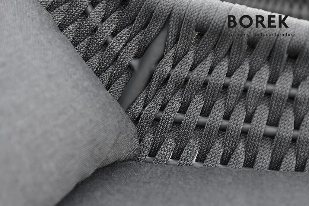 Die Gartenmöbel des Herstellers Borek zeichnen sich durch eine dauerhafte Stabilität und ein modernes Design aus. Eine hochwertige Aluminiumlegierung, die bei 180 Grad pulverbeschichtet wurde, bildet das Gestell der Möbel. Hinzu kommen hochwertige Materialien für die Bespannung. Das Outdoor-Sofa ist frost- und hitzbeständig sowie pflegeleicht. Neben Gartensofas bietet der Hersteller auch Loungemöbel, Gartenliegen und Sonnenschirme, die Sie ebenfalls in unserem Shop online bestellen können. Das Ardenza-Seil kann mit dem Borek Fabric Cleaner gerinigt und mit dem Borek Fabric Protector geschützt werden. Zu diesem Outdoor-Möbelstück ist eine passende Abdeckhülle erhältlich.