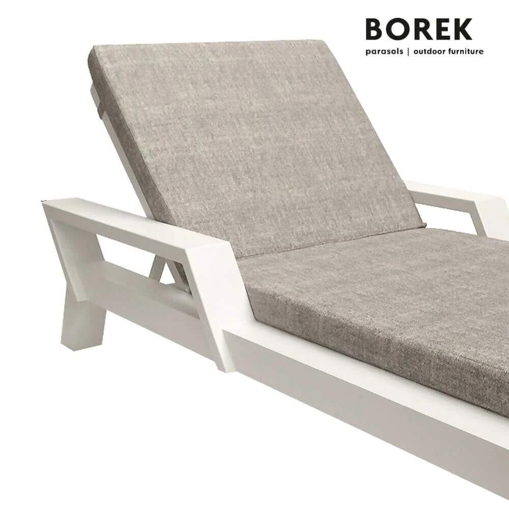 VIKING, die neue Kollektion des Qualitätsmöbelherstellers Borek, überzeugt mit schönen geradlinigen Designs und hochwertiger Materialqualität. Auch bei diesem formschönen Modell einer bequemen Sonnenliege steht diese Möbelmarke Ihrem makellosen Ruf nichts nach und hat ein besonders elegantes Design passend für den modernen Garten entwickelt. Die Grundfläche dieses Designmöbels bilden schlichte Elemente aus Aluminium, die in sorgfältig ausgeführten Arbeitsschritten angefertigt, versiegelt und bei 180 Grad gehärtet wurden. Zur Steigerung des Liegekomforts und der Bequeme, ist im Lieferumfang dieses schönen Möbelstücks eine Polsterauflage aus strapazierfähigem und witterungsresistentem Sunbrella®-Stoff enthalten. Auf diesem gemütlichen Polster mit der besonders angenehmen Haptik, für die Borek bekannt ist, lässt es sich an schönen Sonnentagen wunderbar entspannen und, umgeben von eleganten Gartendekoration, die Idylle Ihres Gartens genießen.