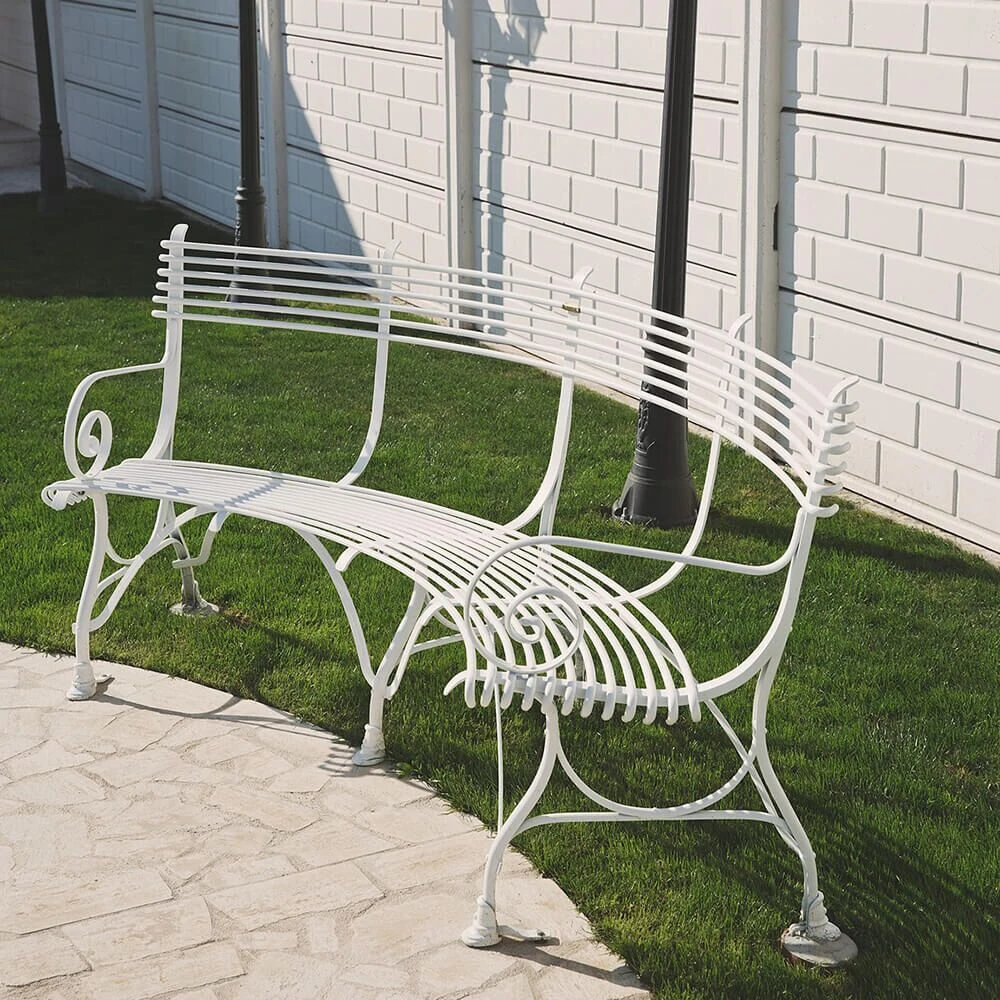Die Vorlagen für diese gebogene Eisen Gartenbank im antiken Design stammen aus dem 19. Jahrhundert. Zu dieser Zeit fand man diese Gartenbänke in vielen französischen Gärten und Parks. Unsere nostalgische Sitzbank wird aus hochwertigem Schmiedeeisen in Handarbeit in einer traditionsreichen Kunstschmiede gefertigt. Ein besonderes Highlight sind die in Form eines Pferdehufs gestalteten Füße der Bank. Ob grün, rot oder klassisch weiß, der farblichen Gestaltung sind innerhalb der RAL Farbpalette keine Grenzen gesetzt. In unserem Sortiment finden Sie ebenso passende Gartenstühle und Gartentische, gerne erstellen wir Ihnen ein unverbindliches Angebot für ein Gartenmöbelset nach Ihren Vorstellungen.