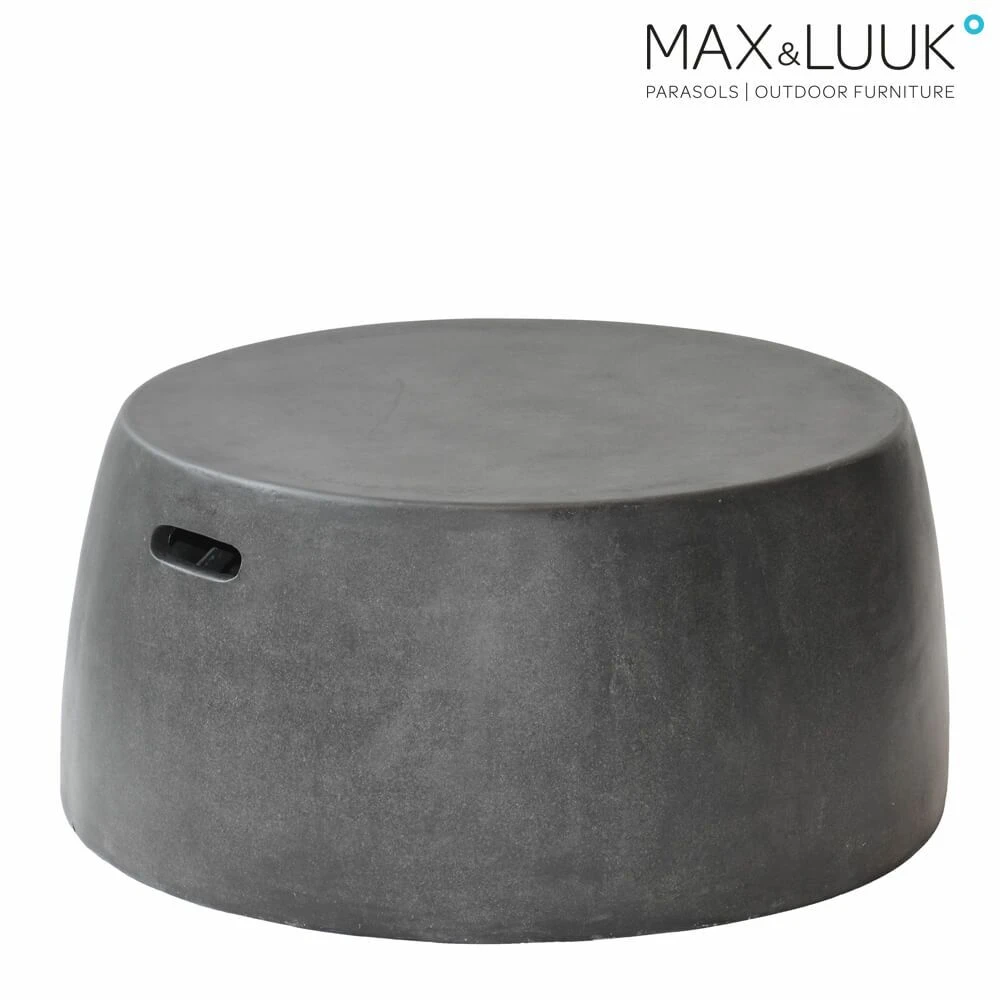 Der graphitfarbene Gartenhocker hat eine Standfläche mit einem Durchmesser von 85cm und wird nach oben hin schmaler. Der Durchmesser der Sitzfläche beträgt 75cm. Der Hocker oder Couchtisch wird aus Fiberglas gefertigt und ist wetterfest. Um zusätzliche Stabiliät zu gewährleisten, wird der Hocker mit Beton beschwert. Der Gartenhocker ist ein praktischer Begleiter mit vielen Funktionen. Entworfen und hergestellt wird das Gartenmöbel von Max & Luuk.