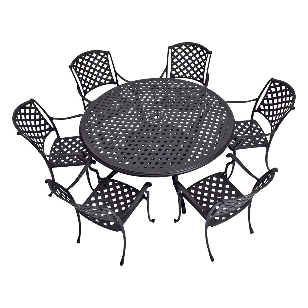 Dieses robuste Möbelset wird unter ständiger Qualitätskontrolle aus Aluminiumguss mit einer schwarzen Beschichtung gefertigt. Die Outdoor-Möbel sind beständig gegenüber Witterung und können ganzjährig im Außenbereich eingesetzt werden. Zur Reinigung sind Wasser und ein Schwamm ausreichend. Von säurehaltigen Reinigungsmittel wird abgeraten. Diese können die Oberfläche schädigen und zu einem Verlust der Wetterbeständigkeit führen.