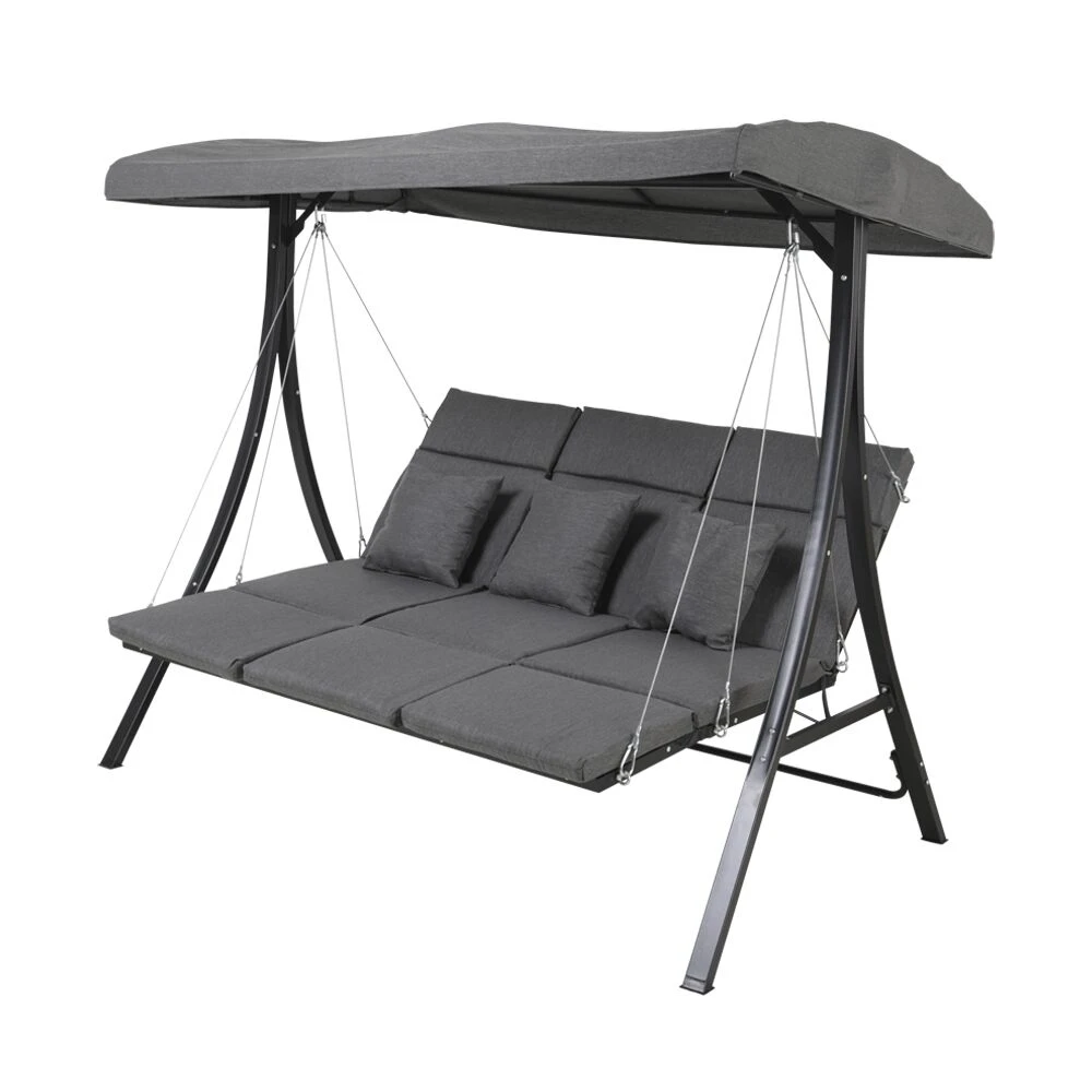 Diese robuste Hollywoodschaukel wird unter ständiger Qualitätskontrolle aus Stahl gefertigt. Die Liegefläche ist aus grauem Textylen. Als Auflagen werden schmutz- und wasserabweisende Olefin-Bezüge (210gr/qm) verwendet. Zur Reinigung sind Wasser und ein Schwamm ausreichend. Von säurehaltigen Reinigungsmittel wird abgeraten. Diese können die Oberfläche schädigen und zu einem Verlust der Wetterbeständigkeit führen.
