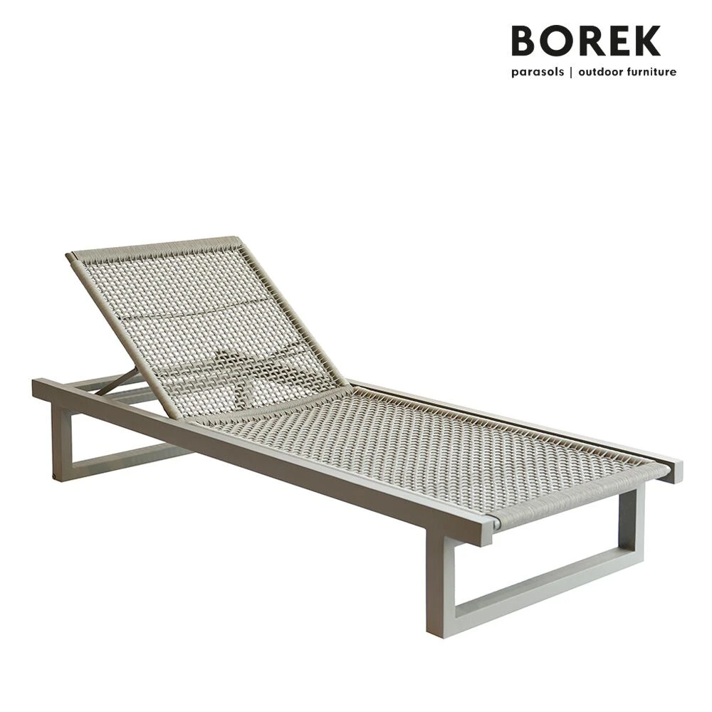 Diese Sonnenliege aus dem Hause Borek überzeugt mit einem modernen Design, das an verträumte Stunden im Spätsommer denken lässt. Das pulverbeschichtete Aluminiumgestell ist mit einer Bespannung aus Ardenza-Seil überzogen. Ardenza ist reißfest, UV-beständig, resistent für Temperaturen zwischen 40 bis 80 Grad und extrem widerstandsfähig gegenüber Witterung.