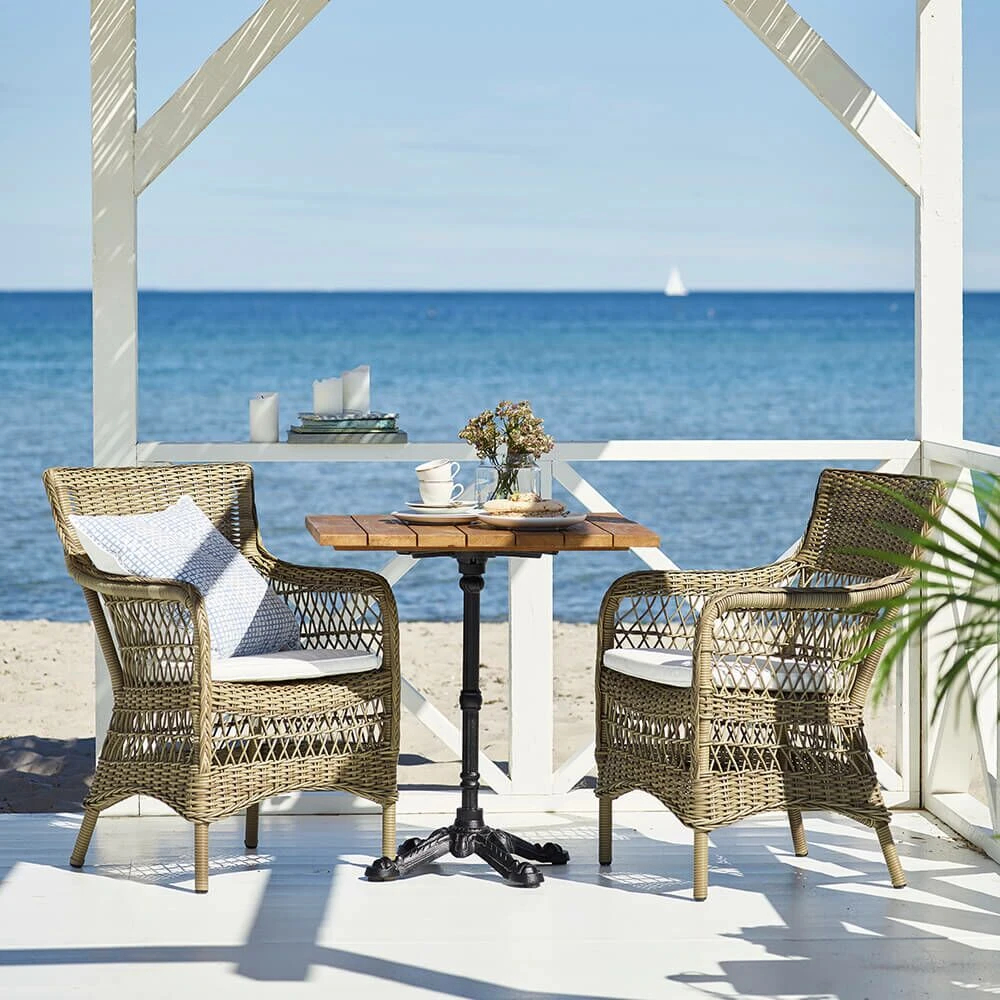 Möbel zu fertigen, die jahrzehntelange Begleiter werden und deren Design Ästhetik und Nutzen vereint, ist das Ziel des Traditionsunternehmens. Die Möbelstücke werden unter Berücksichtigung der Umwelt und des menschlichen Wohlbefindens in Indonesien hergestellt und sind dementsprechend zertifiziert. Die Gartenmöbel aus Teakholz werden aus hochwertigen und nachhaltigen Holz aus Indonesien gefertigt. Das bedeutet, dass die Regierung die Abholzung überwacht und kein gesunder, zu unreifer oder zu kleiner Baum sein Leben für die Möbelherstellung lassen muss. Die Tische können mit einem Schwamm, Wasser und einer milden Seife gereinigt werden. Bei der Pflege mit Teaköl kann das braune Holz etwas dunkler werden.