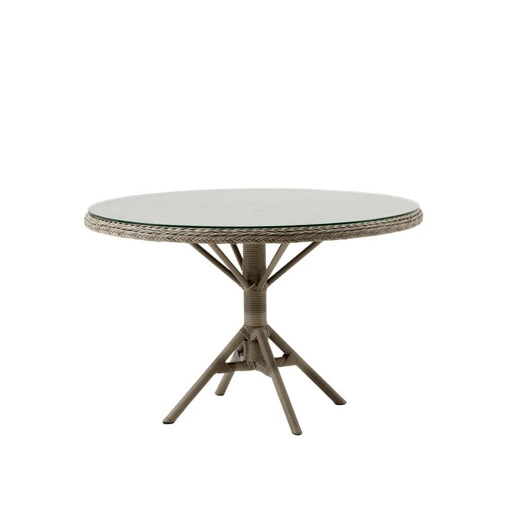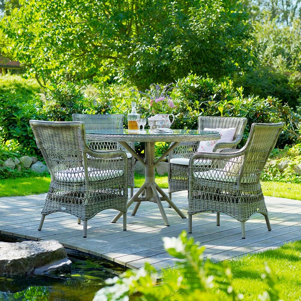 Die Möbel dieser Reihe in antikgrau sind inspiriert vom Kolonialstil alter britischer Kolonien. Die Basis dieses runden Esstisches bildet ein Alumniumgestell, welches mit Polyrattanfasern straff umflochten wird. Sie können zu diesem Esstsich eine Glasplatte dazu wählen. Die wetterfesten Materialien machen den Tisch zu einem wunderbaren Begleiter in der Gartensaison.