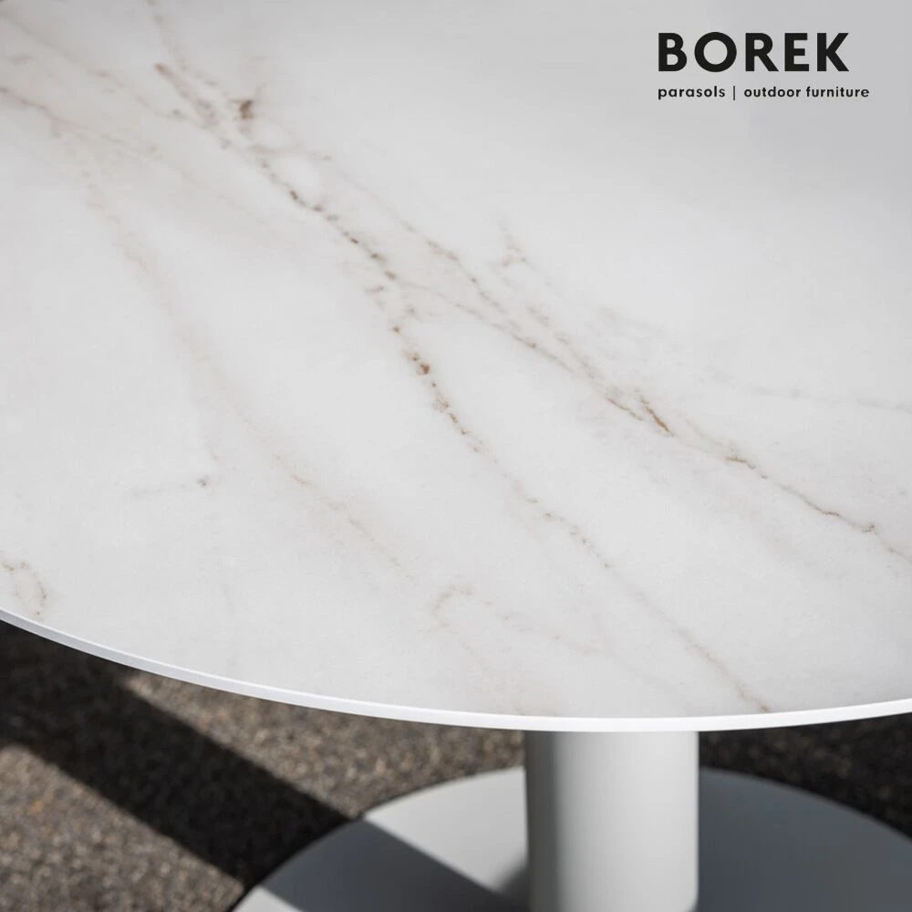 Diese Gartentische aus dem Hause Borek überzeugen mit einem modernen Design, das an verträumte Stunden im Spätsommer denken lässt. Das Edelstahlgestell, welches bei 180 Grad pulverbeschichtet wurde, ist pflegeleicht und robust. Die Dekton-Tischplatte wird unter extrem hohen Temperaturen gefertigt, welche die Platte steinähnlich werden lassen. Dekton besteht aus den selben Rohmaterialien, welche auch bei der Produktion von Glas, Porzellen and Quartz zur Verwendung kommen und ist somit witterungsbeständig. Das Material ist beständig gegenüber Kratzern, Hitze, Kälte, UV-Strahlung und ist farbecht. Die Tische sind somit absolut wetterfest.