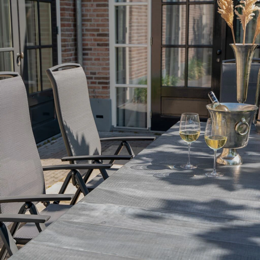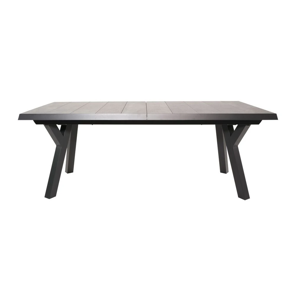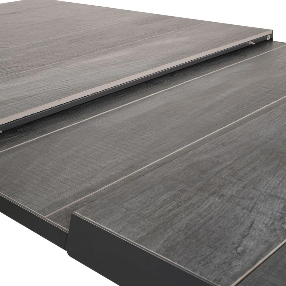 Dieser robuste Gartentisch wird unter ständiger Qualitätskontrolle aus Aluminium gefertigt. Als Tischplatte werden Keramikelemente mit Holzoptik verwendet. Die Outdoor-Möbel sind beständig gegenüber Witterung und können ganzjährig im Außenbereich eingesetzt werden. Zur Reinigung sind Wasser und ein Schwamm ausreichend. Von säurehaltigen Reinigungsmittel wird abgeraten. Diese können die Oberfläche schädigen und zu einem Verlust der Wetterbeständigkeit führen.