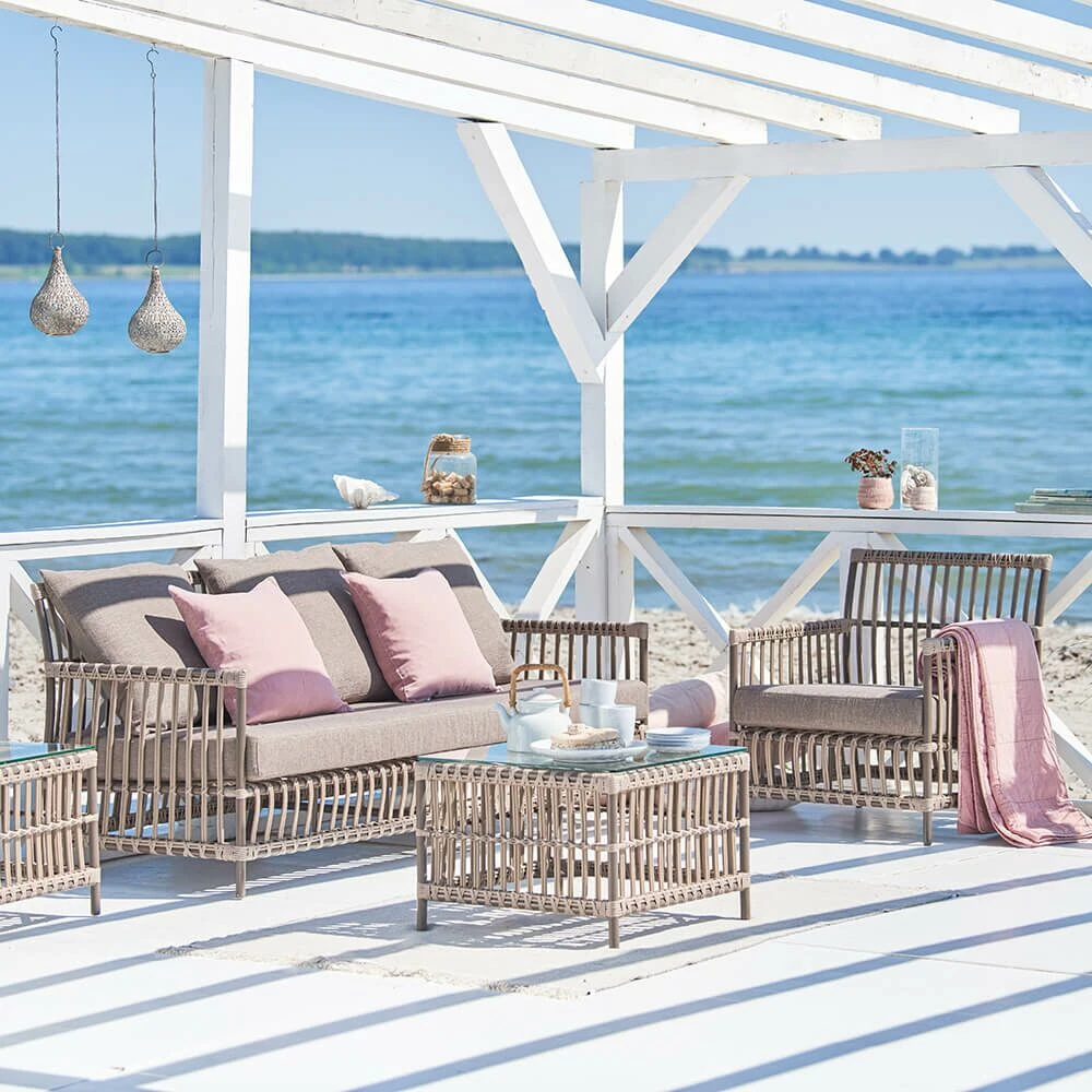 Mit einer Leidenschaft für Rattan, Handwerkskunst und Nachhaltigkeit überzeugt der Hersteller international. Möbel zu fertigen, die jahrzehntelange Begleiter werden und deren Design Ästhetik und Nutzen vereint, ist das Ziel des Traditionsunternehmens. Die Möbelstücke werden unter Berücksichtigung der Umwelt und des menschlichen Wohlbefindens in Indonesien hergestellt und sind dementsprechend zertifiziert. Viele Designs wurden von namenhaften Künstlern aufgegriffen und werden durch die Fertigung aus wetterfesten Materialien neu interpretiert. Handgebogene Aluminiumrahmen werden mit der Kunstfaser Art Fibre in Handarbeit umflochten. Alu Rattan ist pulverbeschichtetes Aluminium, welches stoß- und kratzfest ist. Die Kunstfaser Art Fibre ist eine Faser aus gefärbten und strapazierfähigen Polyethylen. Da sie temperatur- und UV-beständig ist, hält die Kunstfaser jedem Klima stand. Die Struktur dieses Polyrattans ist auf der einen Seite sehr stark und kann über Jahre hinweg ihre Form behalten, auf der anderen Seite ist sie sehr flexibel und bietet einen angenehmen Sitzkomfort. Die Glasplatte für den Tisch besteht aus gehärtetem 8mm Glas und ist langlebiger als gewöhnliches Glas. Es sollte mit Vorsicht behandelt werden, da eine beschädigte Kante oder eine zerkratzte Oberfläche dazu führen können, dass es plötzlich reißt. Alu Rattan, Art Fibre und das Glas sind sehr pflegeleicht und lassen sich mit Wasser und einer milden Seife reinigen.